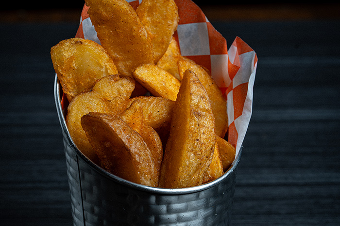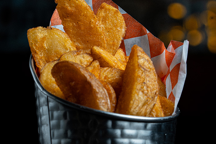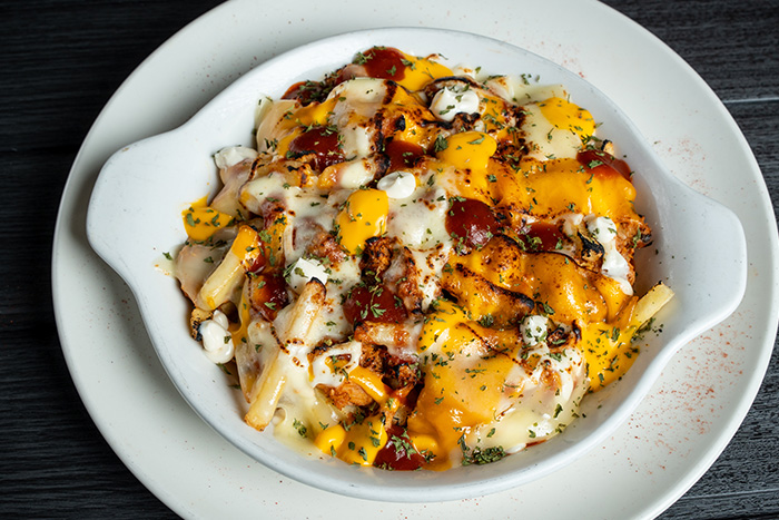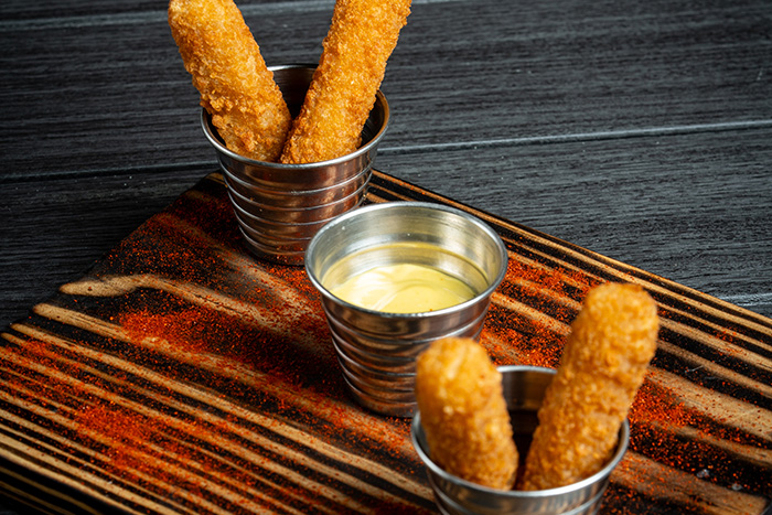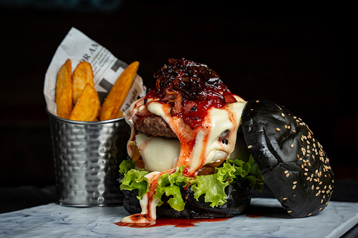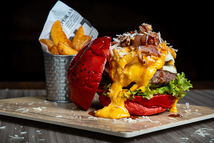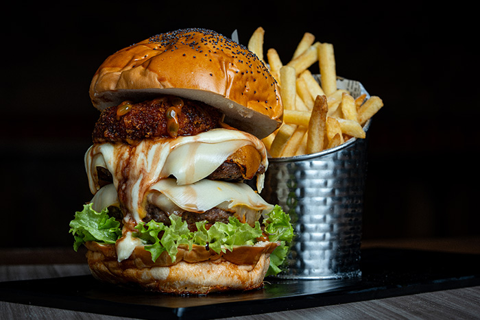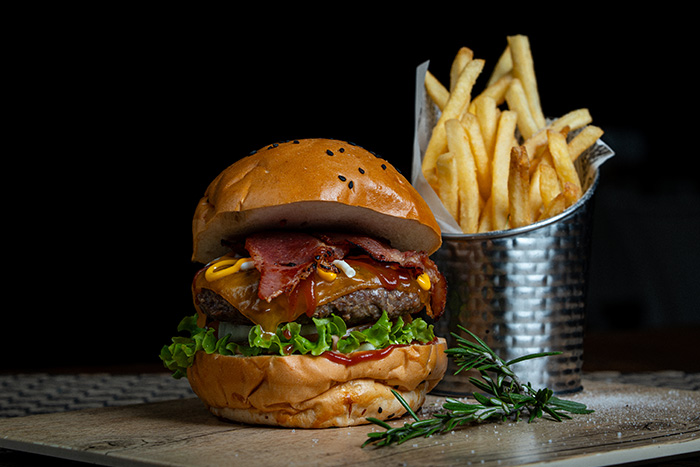 Carne de res, tocino, queso manchego, aros de cebolla, jitomate, lechuga y aderezo.