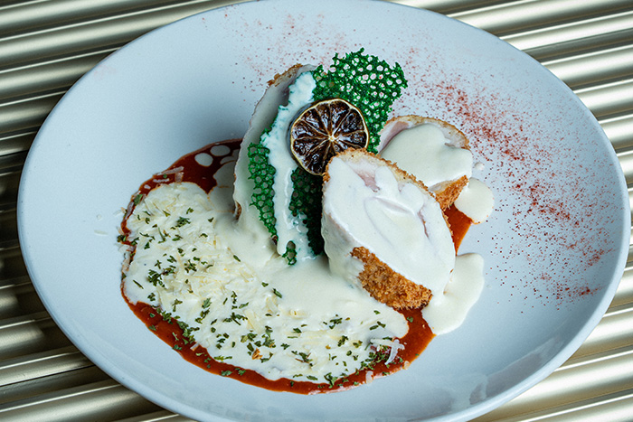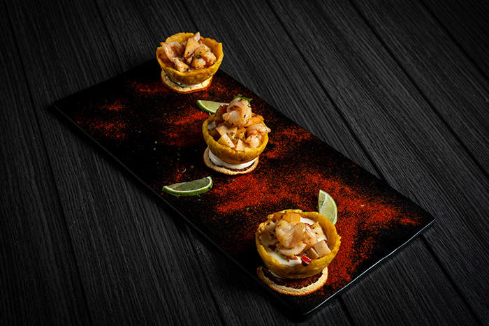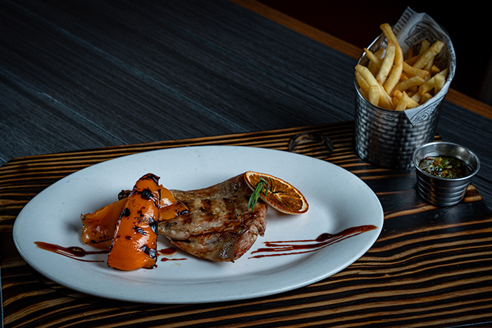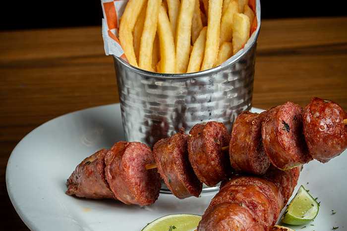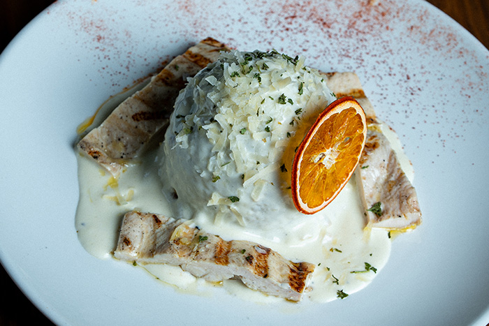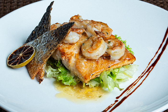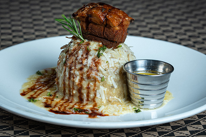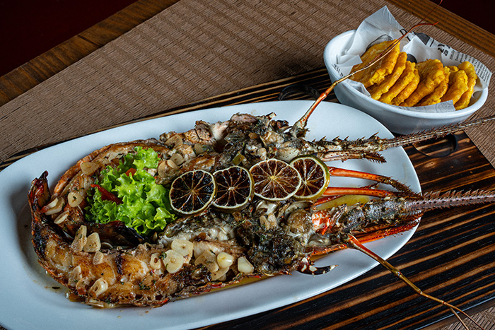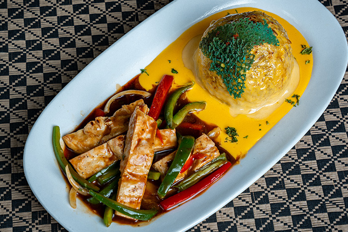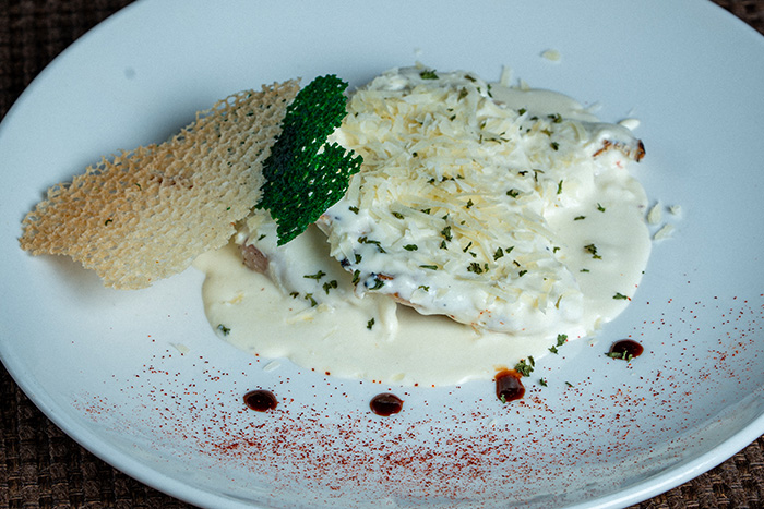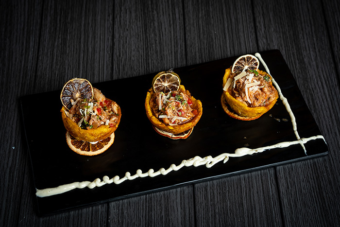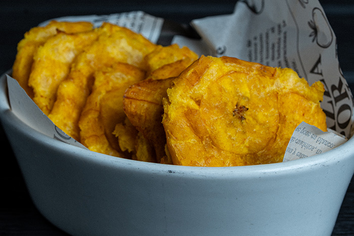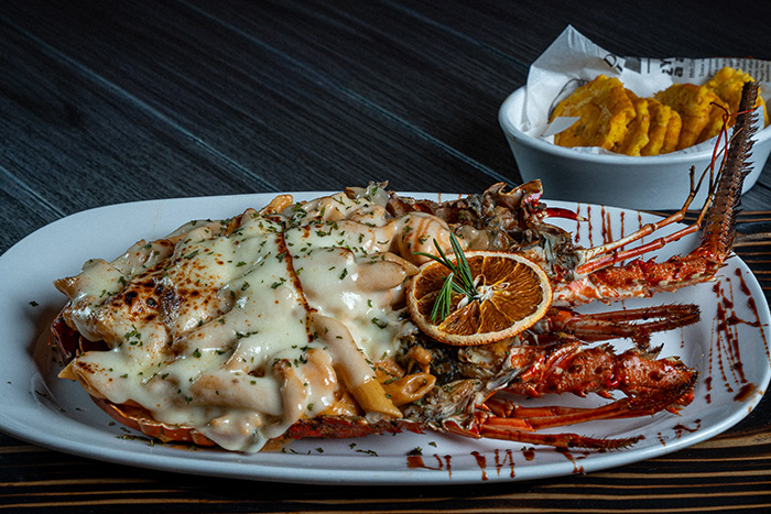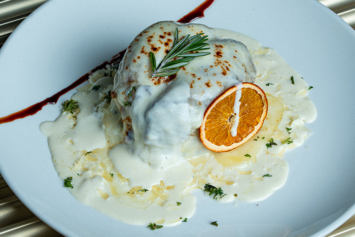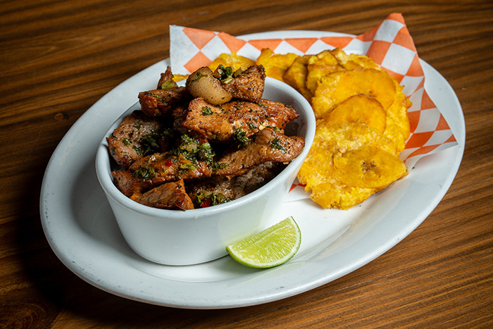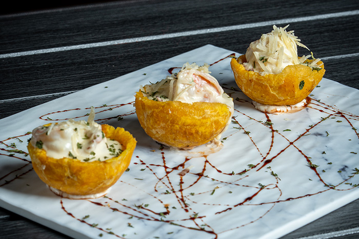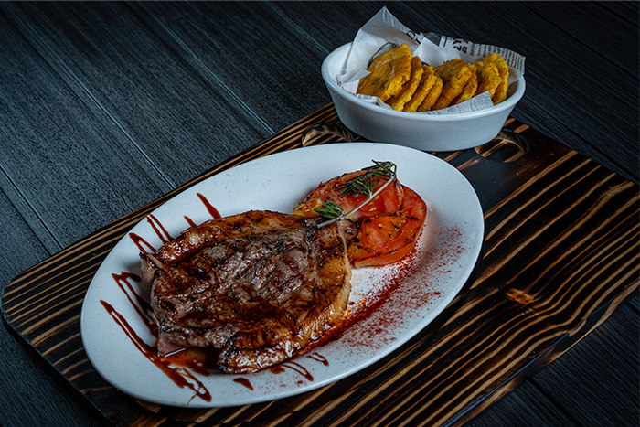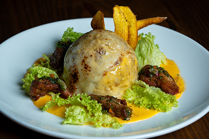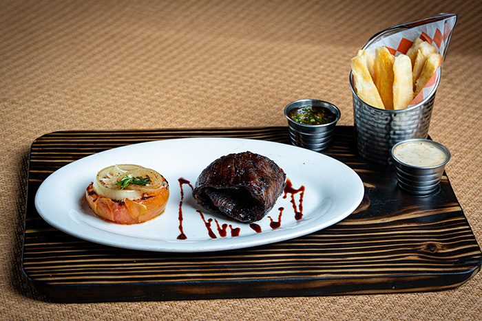 Deliciosa combinación de 8onz de churrasco importado relleno de plátano maduro y una rica salsa cremosa.
